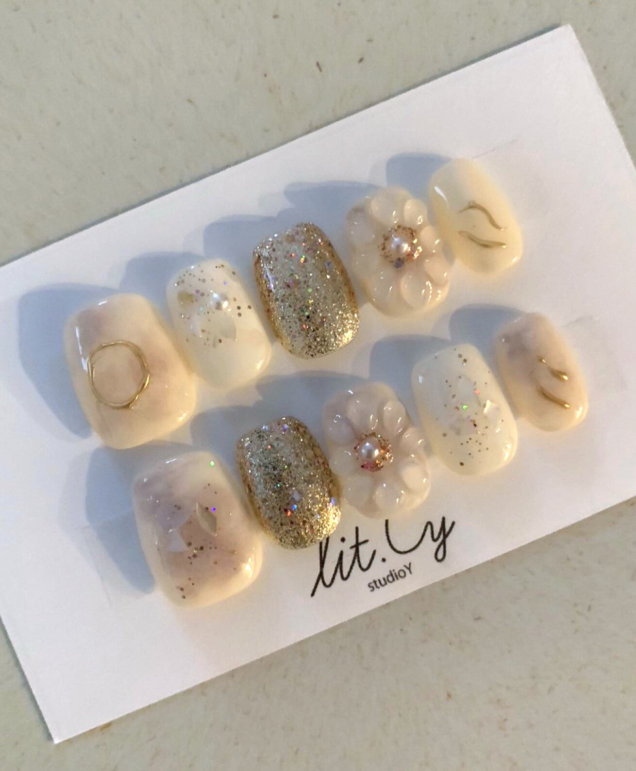 立体的なフラワーモチーフが美しく配置されたこのネイルチップは、日常使いはもちろん、特別なイベントにもぴったりです。自分の手を簡単におしゃれに変身させる手助けをしてくれるでしょう!しっかりとしたフィット感で、長時間装着しても快適です。ネイルアートが苦手な方でも、手軽にオシャレを楽しむことができますよ◎
