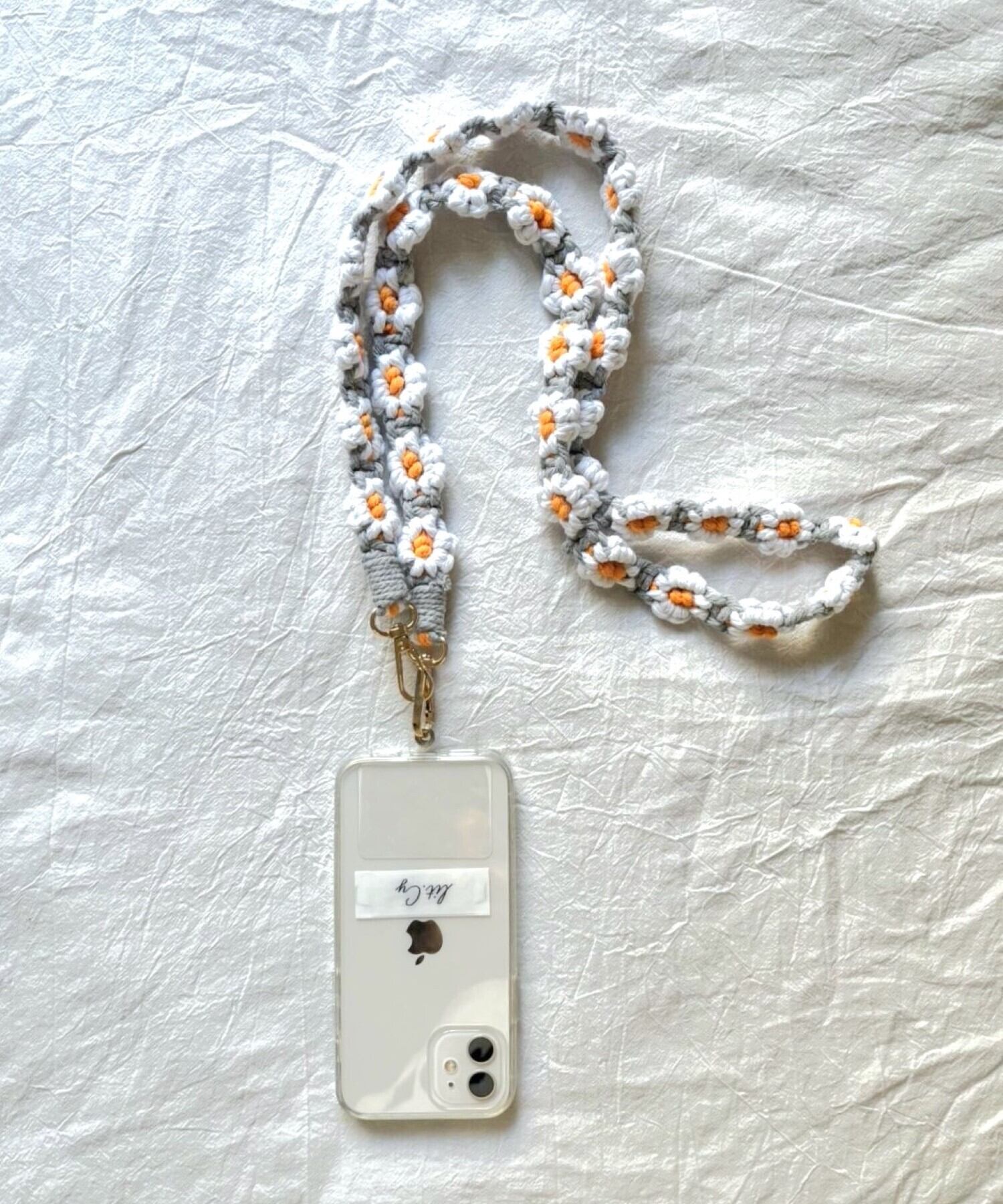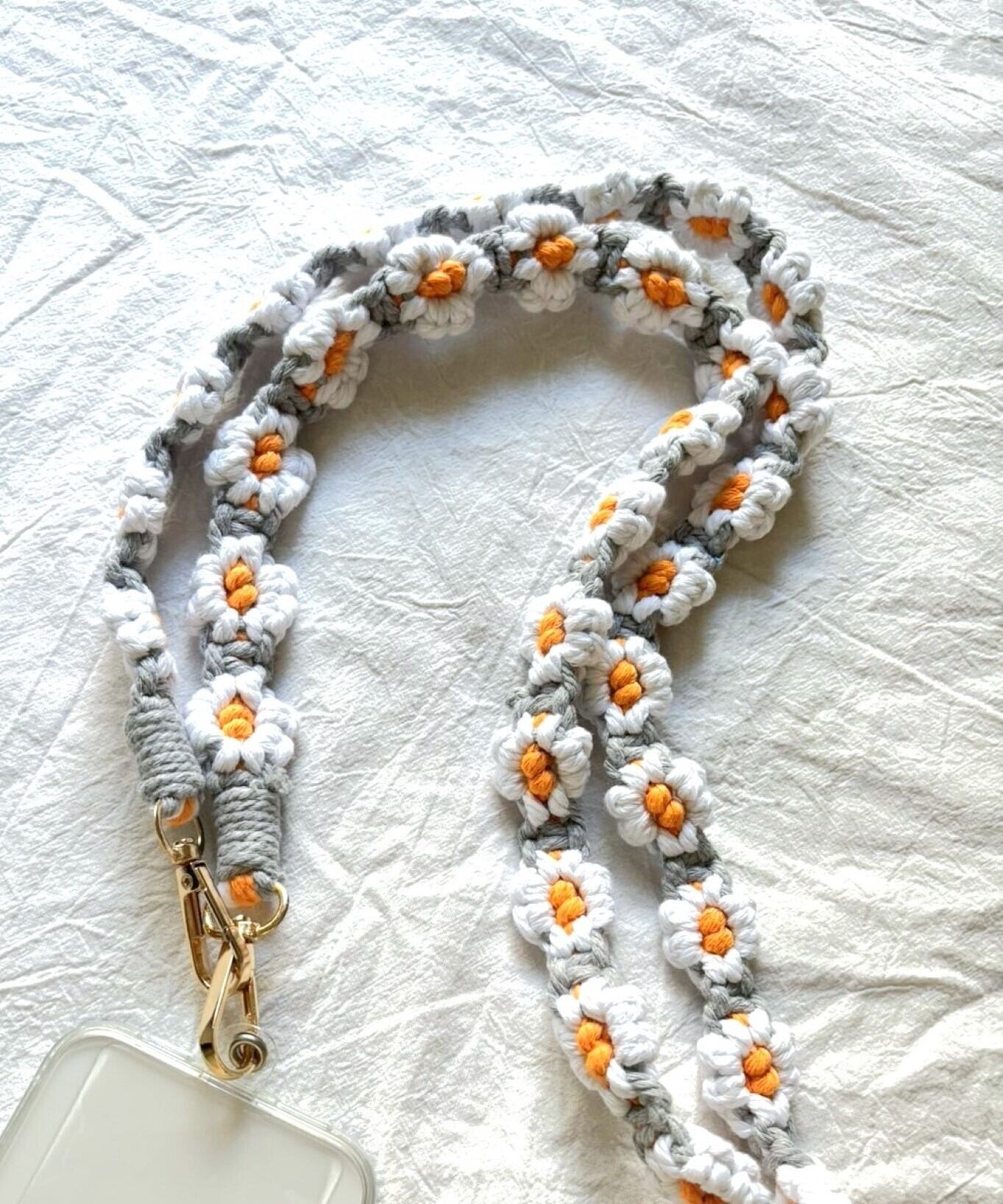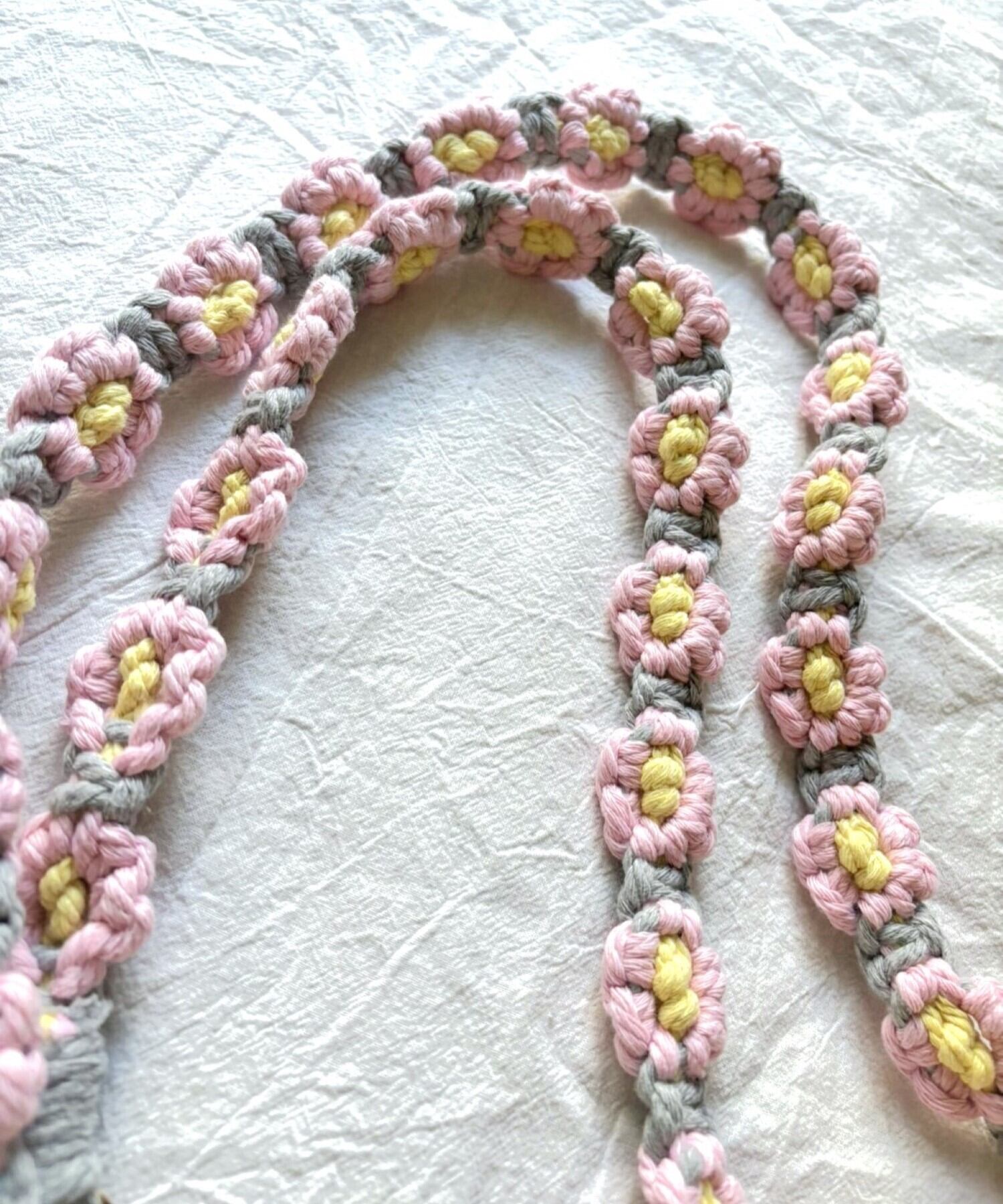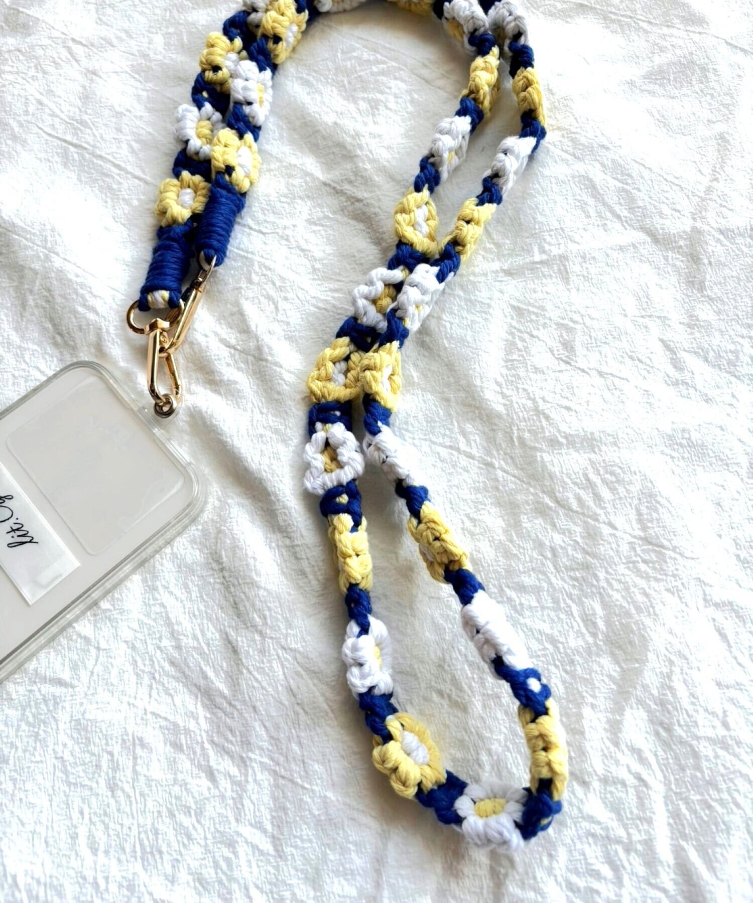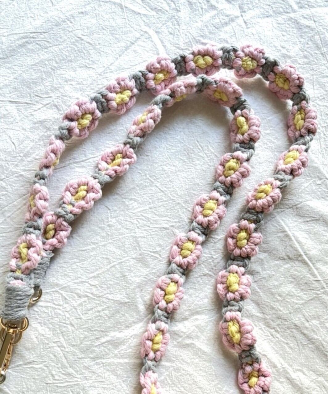 お花の マクラメ モチーフ編みがかわいいスマートフォン用ショルダーストラップ。
