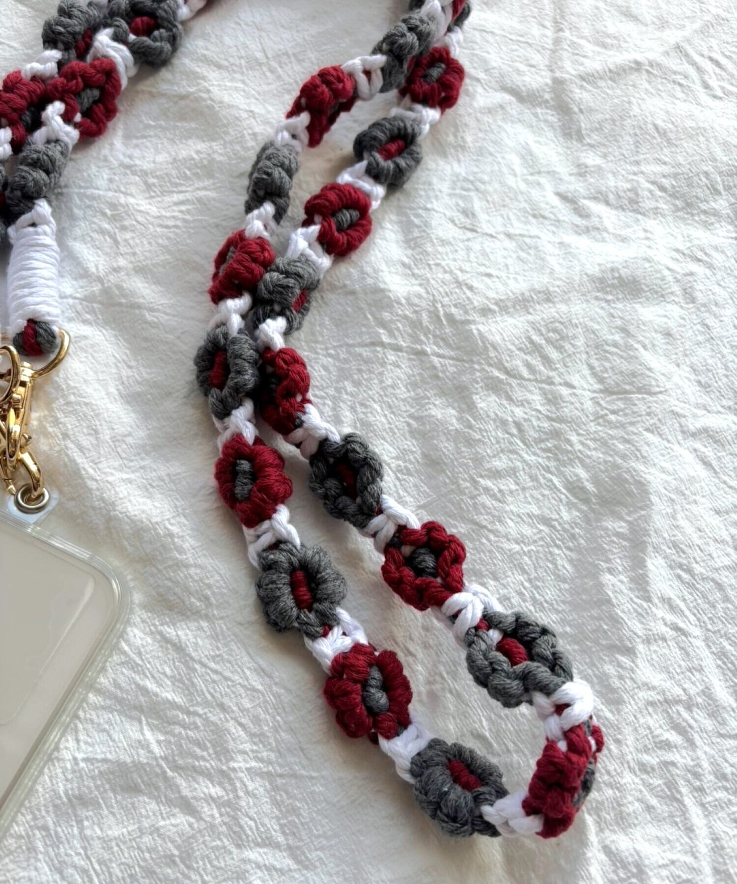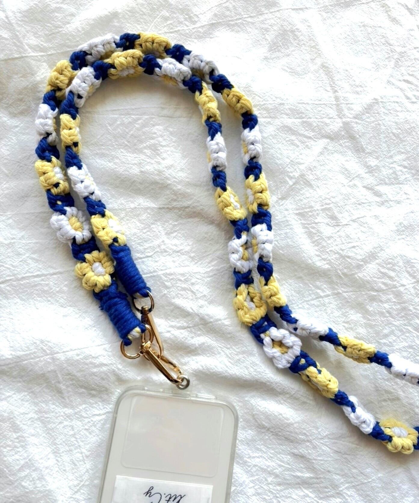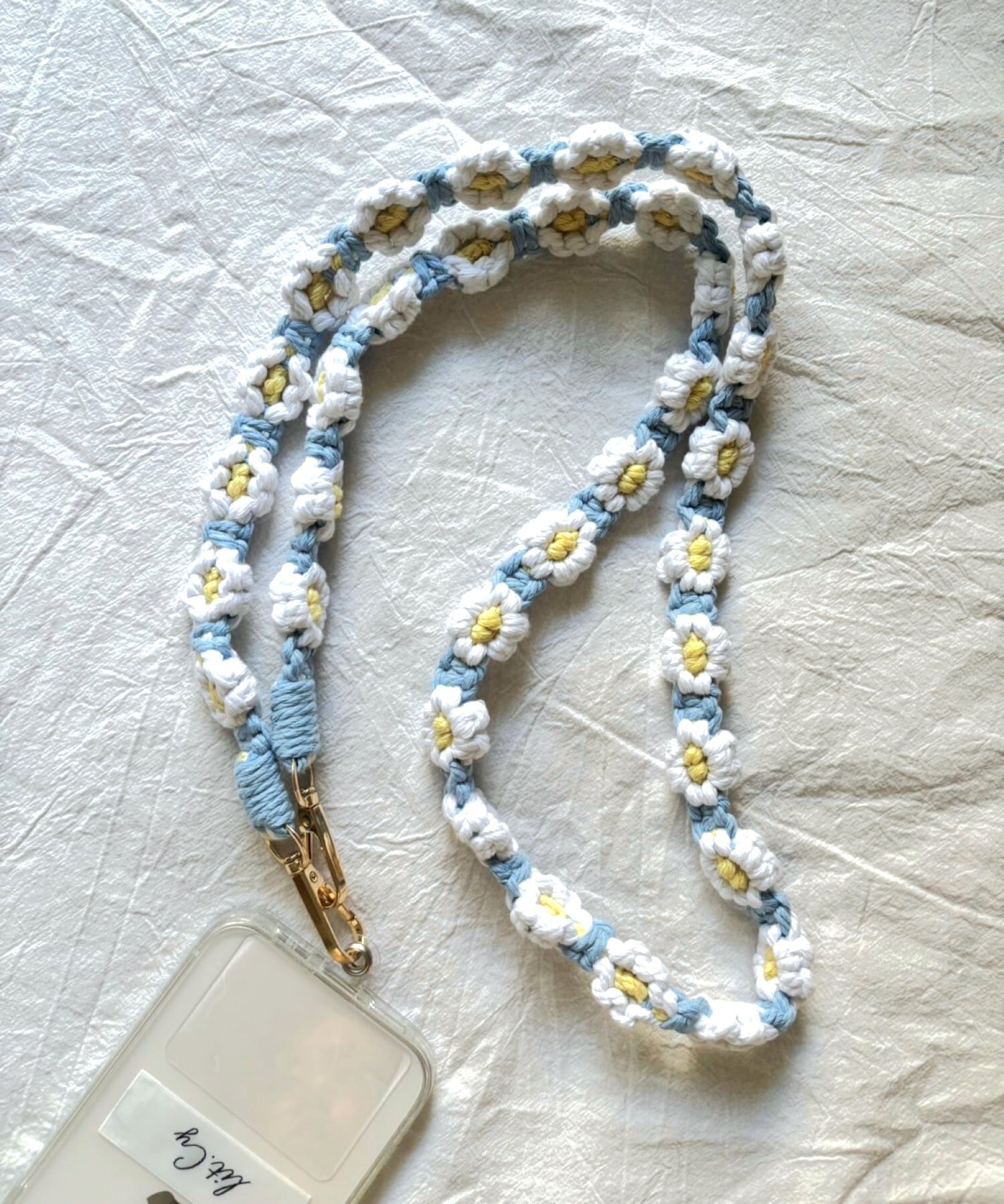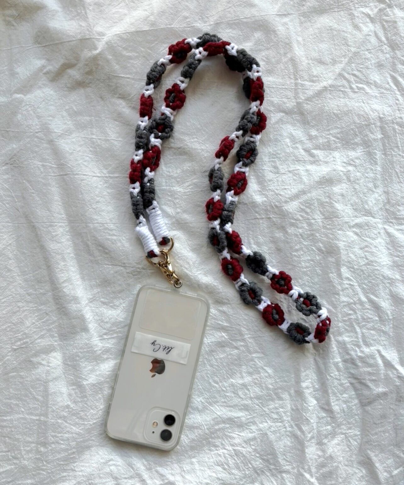 お花の マクラメ モチーフ編みがかわいいスマートフォン用ショルダーストラップ。