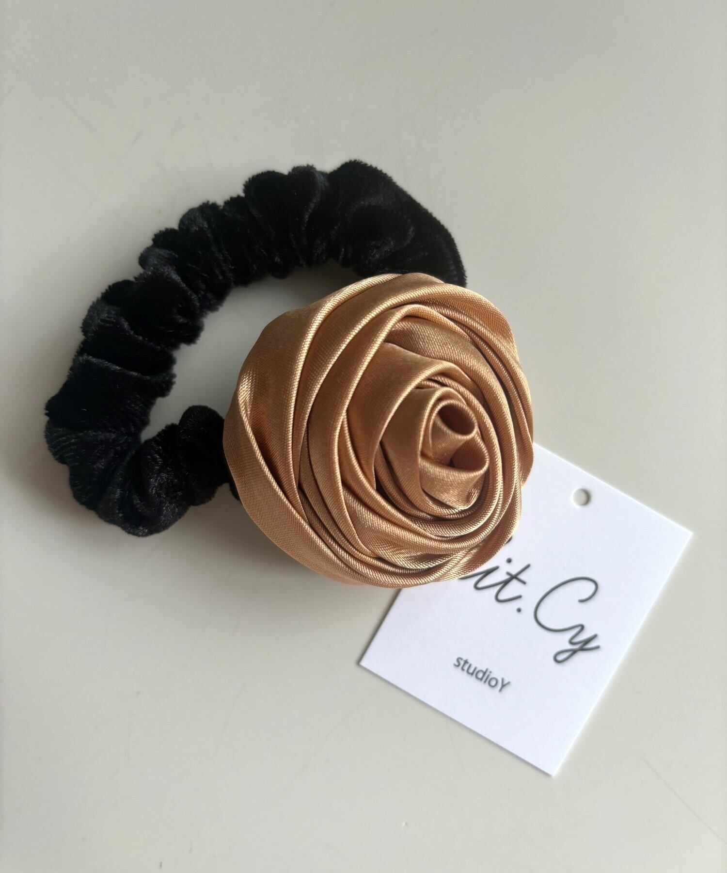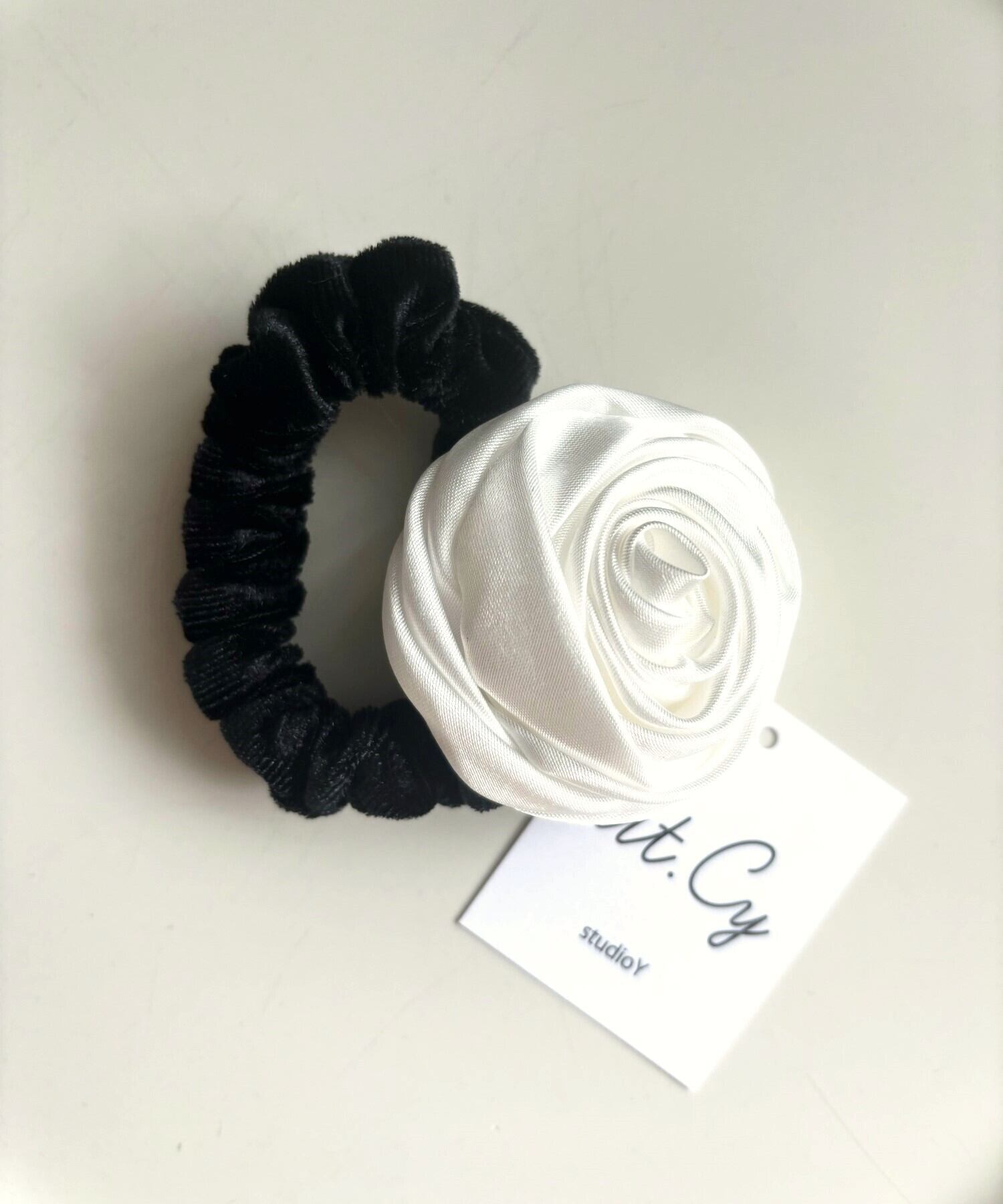 立体的なバラが印象的で華やかなサテンシュシュ。